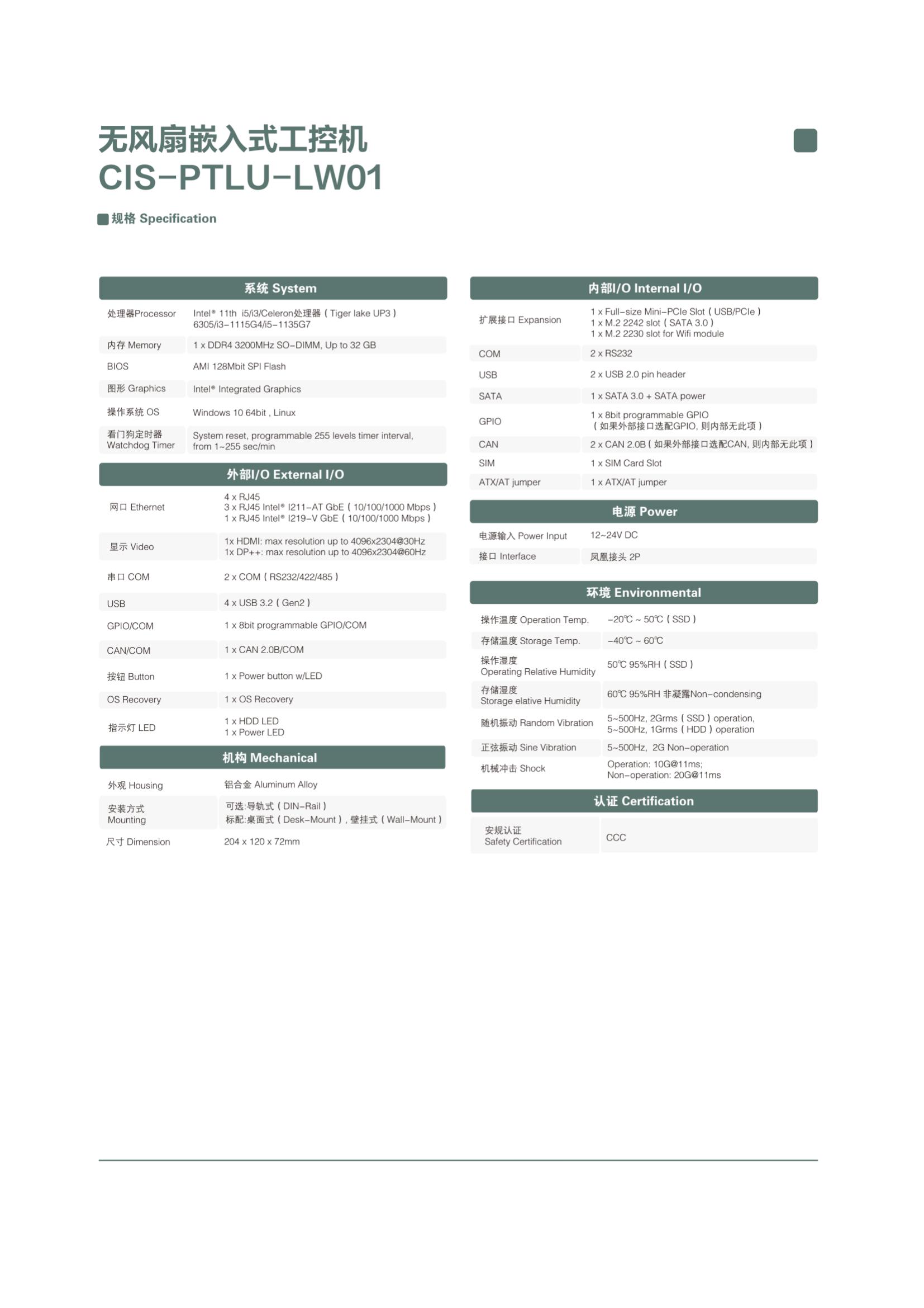 CIS-PTLU-LW01是一款无风扇高性能边缘计算设备,产品搭载Intel 11th Tigerlake UP3 平台处理器,支持12~24V宽压输入,具有高稳定性的Intel四千兆网口,串口、USB、GPIO、CAN 2 0 ,4K HDMI,DP++双显示等功能,并具有源控系列产品共有的OS Recovery功能